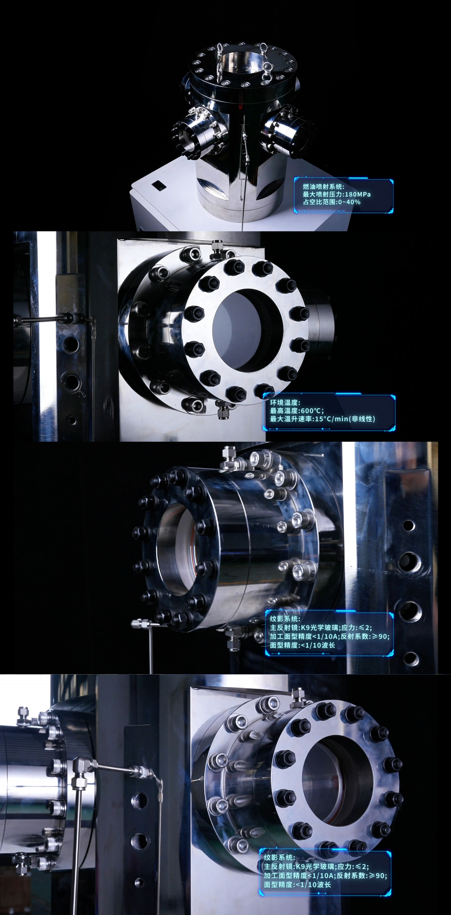 高温型定容弹可实现不同背压环境、温度环境、流动强度、控制参数、点火位置条件下的空气辅助喷射重油喷雾特性及燃烧特性分析,广泛应用于航空航天、内燃机、能源与动力工程、动力机械及工程、含能材料、新能源与材料、化学与材料工程等领域。