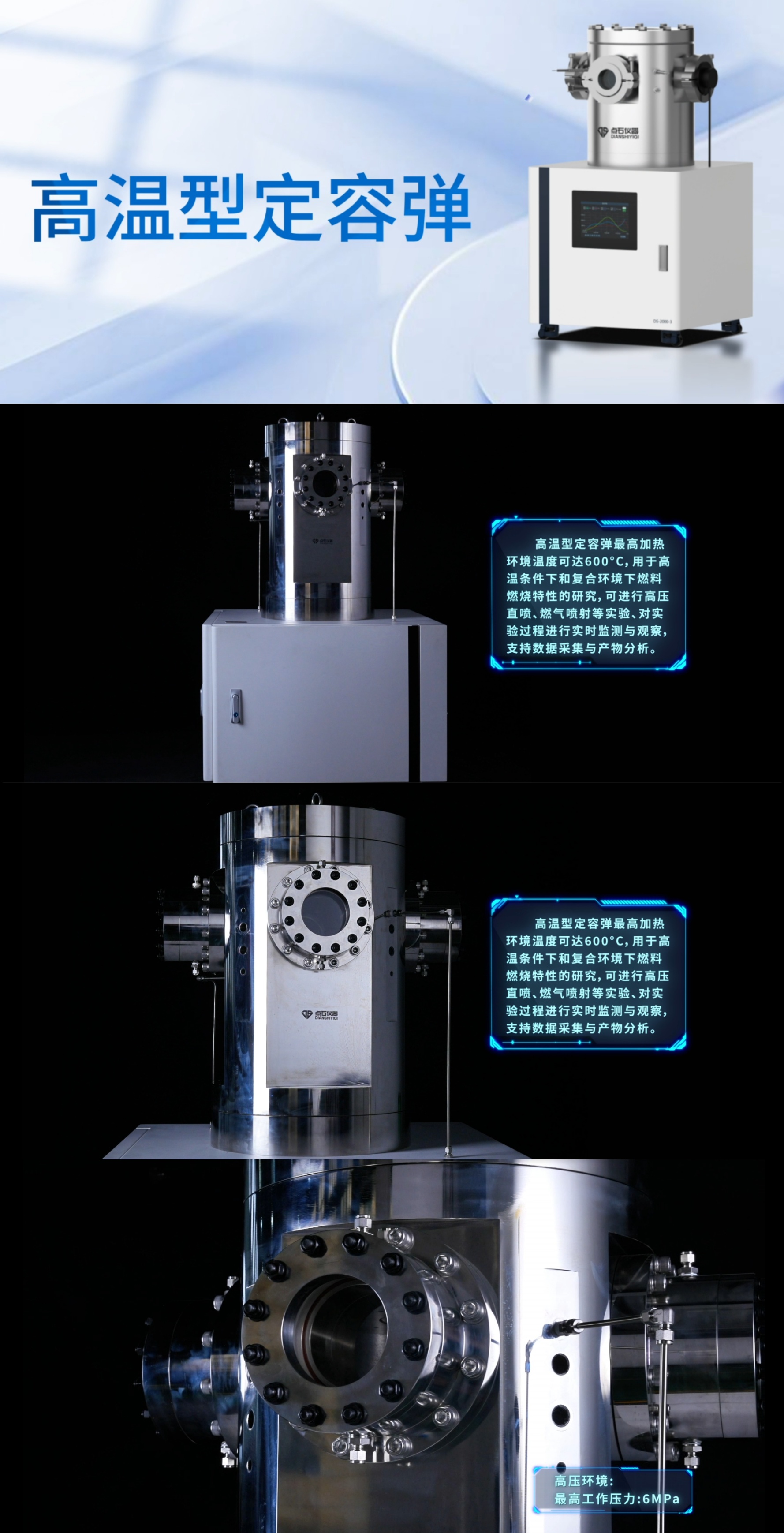 点石仪器作为工程热物理领域实验室设备定制化解决方案供应商,研制的非标定制款高温型定容弹最高加热温度可达600℃,用于研究高温条件下和复合环境下的燃料燃烧特性,对实验过程进行实时监测与观察,支持数据采集与产物分析,用于层流燃烧、一次性燃烧、连续燃烧的研究。