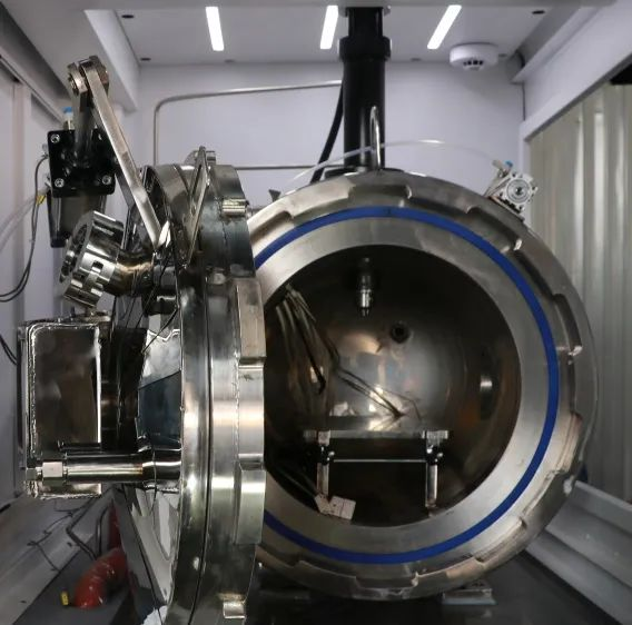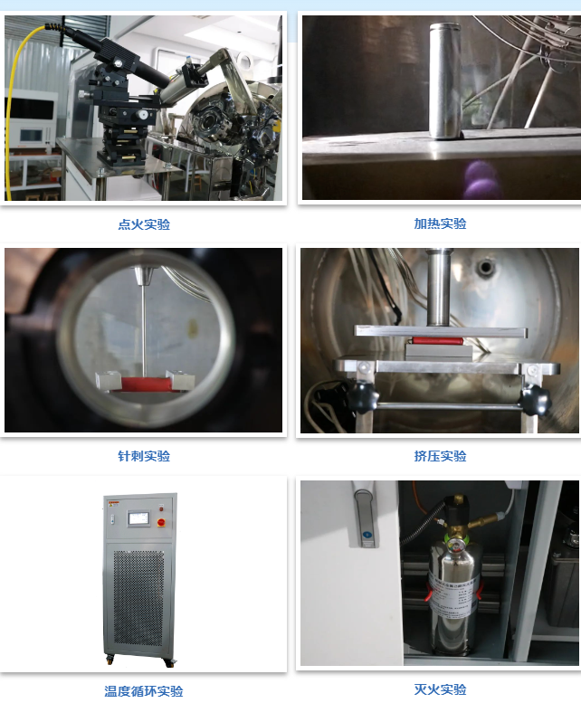 电池综合性能实验舱可实现多种环境要素(温度、压力、气氛等)耦合,对电池进行多类测试(针刺、挤压、过充、过放、短路、温度循环、点火、灭火),用于单体电池及小型电池模组的综合性能测试。