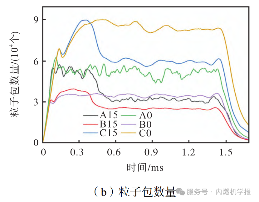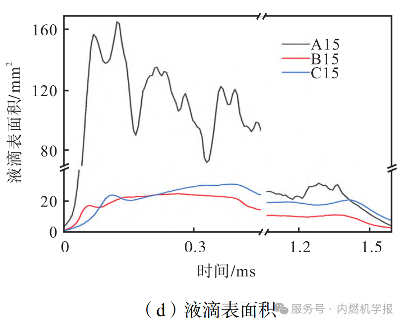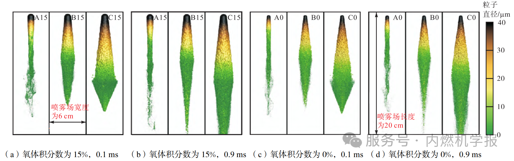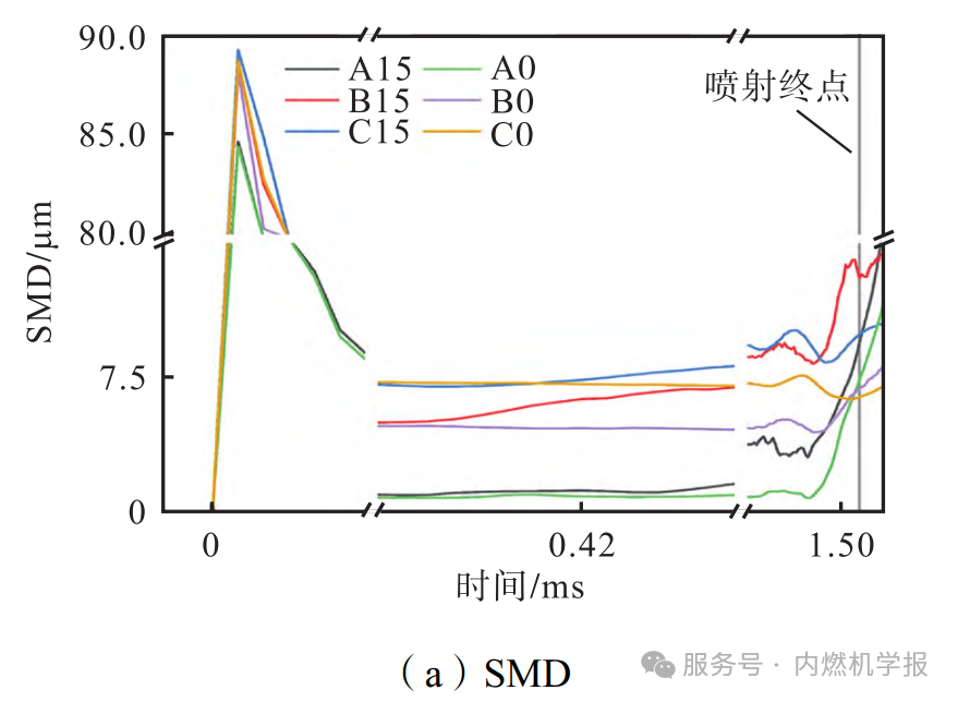 (2) SMD 和液滴直径分布受着火与燃烧作用的影响截然相反;液滴表面积的下降速率大于液相体积的下降速率,导致含氧条件 SMD 略有增加。
