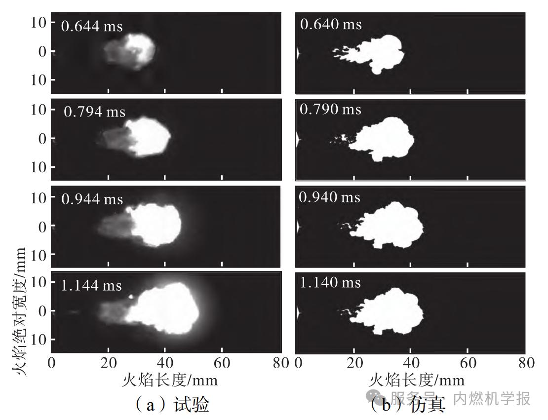 图 4 为 1 600 K 以上区域表征燃烧火焰形态与自发光火焰图像的对比。可知,火焰的长度、宽度和面积以及火焰上游(靠近喷嘴)与喷嘴的距离都与试验有较好的相似度。然而图 3(a)中 VPL 的验证结果表明,使用质量分数法和密度梯度法得到的 VPL 存在较大差异。高速纹影法和密度梯度法获得的 VPL 随时间增加,而使用质量分数法获得的 VPL 在燃烧发生后保持动态稳定,主要原因是火焰区域的气相燃料由于燃烧消耗导致质量分数低于阈值而未被统计。此外,氧化和裂解等作用使统计目标演化为其他组分而导致。