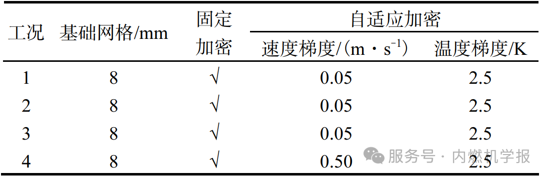 笔者建立 CVCC 模型,并使用 Converge 在 4 种工况下进行模型验证。基础网格尺寸为 8 mm,表 2 为网格设定与加密策略,进行网格加密后最小网格尺寸为 0.062 5 mm。对喷孔附近进行 7 级固定加密,且根据速度和温度梯度施行 7 级自适应加密。图 1 为 CVCC 的几何模型尺寸及加密效果。使用 163 种组分和 887 个反应的详细化学反应机理结合 SAGE 化学动力学求解器描述燃料氧化、着火和燃烧过程中的化学反应。采用 KH-RT 描述燃料的破碎过程,其中模型常数 B0 和 B1 分别取值为 0.61 和 50。大涡模拟(LES)和雷诺平均(RANS)都可以对喷雾过程中的湍流运动进行较为精确地描述,但在高喷射压力条件下,LES 具有更好的瞬态精确度,因而笔者使用 LES 求解喷雾和燃烧过程中涉及的湍流运动。分别采用液体燃料质量分数为 90% 和气态燃料质量分数为 0.1% 作为计算 LPL 和 VPL 的阈值。研究中 LPL 使用 ECN 的推荐值,而 VPL 则根据密度梯度进行测算。对密度求导后得到密度梯度的切片,经图像处理与识别得到密度梯度图像边缘与喷嘴的最大垂直距离。使用密度梯度统计 VPL 的优势在于其与纹影技术原理更为接近。同时,可以避免因燃烧导致仿真计算中以质量分数阈值统计 VPL 产生的波动与错误。将燃烧化学发光强度最大值的一半所对应的时刻定义为 IT。以 OH* 的化学荧光表示火焰的位置,火焰与喷嘴间的最短距离定义为 FLOL。