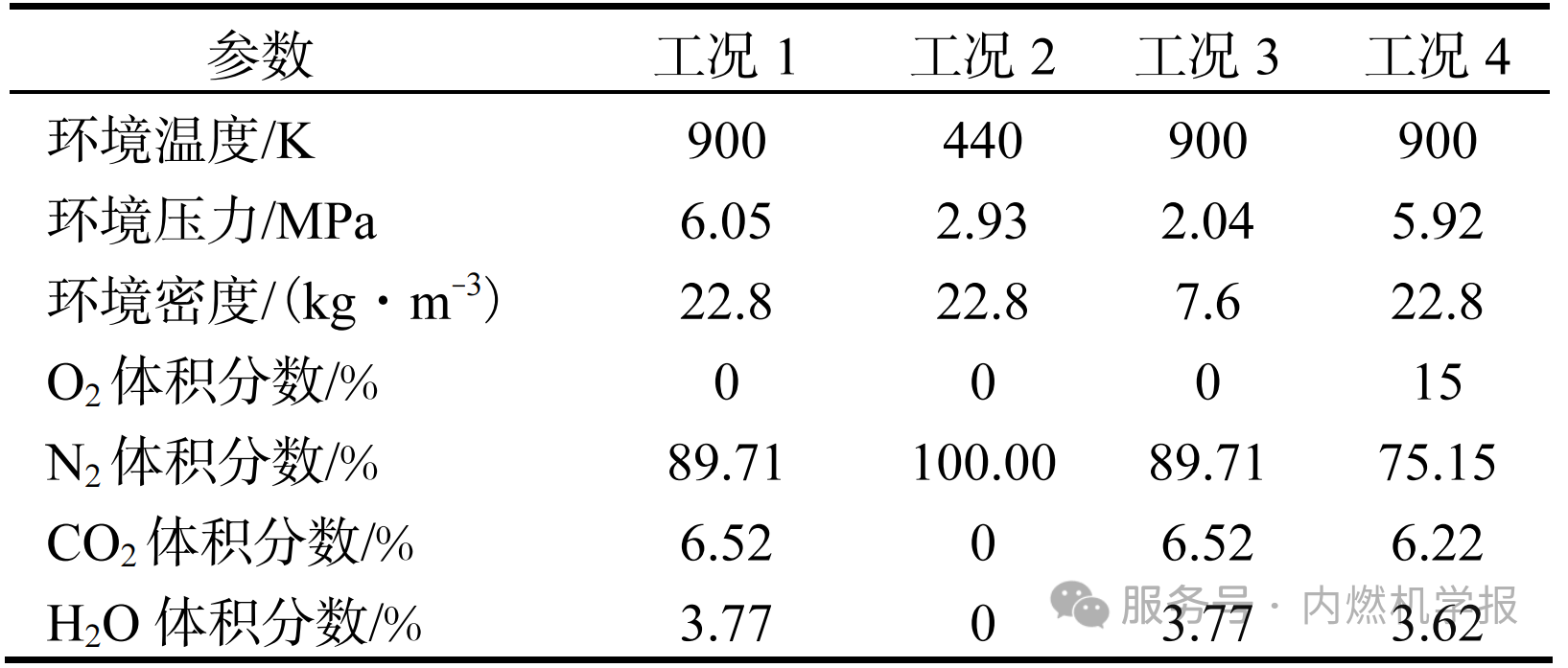试验在 ECN 最新一代的 CVCC 上开展。该装置的环境条件覆盖了绝大多数的柴油机工况,环境温度为 450~1 300 K、环境密度为 3~60 kg/m³ 且环境氧体积分数为 0%~21%。CVCC 的有效容积为 1.15 L,通过燃烧可燃混合气营造高温、高压的环境条件。喷射系统适用于多种燃料,最大喷射压力为 150 MPa,最大喷孔直径为 0.5 mm。试验的 4 种工况条件如表 1 所示,使用喷孔直径为 0.09 mm 的单孔喷油器。喷射压力为 150 MPa,喷射持续期为 1.54 ms,单次喷射 3.46 mg 的正十二烷。试验中针对不同工况采用了多种光学观测手段,获得液相喷雾贯穿距离(LPL)、气相喷雾贯穿距离(VPL)、火焰浮起长度(FLOL)、着火时刻(IT)和火焰形态等参数。