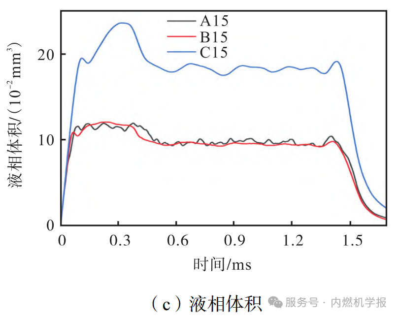 高黏度燃料的液滴稳定性增加、破碎难度增加,破碎后的液滴直径增加、雾化质量变差。SMD 是评价雾化质量的重要指标,能体现燃料的破碎与蒸发特性。SMD 越小说明雾化程度越好。图 7 为不同燃料的液相喷雾参数。图 7(a)中,SMD 的变化与黏度呈正比,且最大差异超过 85%。喷雾初期,SMD 与是否发生氧化反应无关,着火前 SMD 有轻微的上升趋势,喷射结束后 SMD 显著上升。为了极大程度地降低计算时间、节约计算资源,Converge 在求解喷雾的过程中引入了粒子包(parcel)的概念。粒子包是由一系列半径、速度和温度等相同的燃料液滴组成,因而粒子包的数量与喷雾场中液滴直径的种类相同,如喷雾场中有 x 个粒子包,就会有 x 种液滴直径。图 7(b)为燃料黏度对粒子包数量的影响。根据粒子包与粒子直径的对应关系,可知,液滴直径种类与 HFO 的黏度无关,但直径种类都因燃烧而降低。同时,液滴表面积的下降速度大于液相体积的下降速度,使 SMD 上升,因而粒径种类降低说明氧化与燃烧促进大直径液滴的破碎与小直径液滴的蒸发。液相体积与表面积变化趋势说明在着火前低黏度对液滴破碎有利。燃料 B 和燃料 C 的液滴表面积和 SMD 接近,但液相体积相差较大,而二者的粒径种类相差超过 70% ,因而可以推断燃料 C 喷雾的大直径液滴占比更多。同时,更大的液滴表面积强化了液滴与环境的相互作用,蒸发与卷吸效果增强。燃料黏度、雾化和蒸发等过程都会影响液滴直径的分布规律。图 8 为 0.1 ms 和 0.9 ms 时刻喷雾场内的液滴分布和液相形态。液相喷雾在径向的扩散能力与黏度呈正比。黏度增加,液滴的分布形态变得中部宽而头尾窄,液相喷雾的最大宽度增加。液滴分布也反映出黏度越低,大直径液滴占比越低,液相喷雾前端的分散度越好。着火与燃烧加速了小直径液滴蒸发,SMD 减小,喷雾体积降低,证明了燃料 C 的液相喷雾中大直径液滴占比更多的推断。