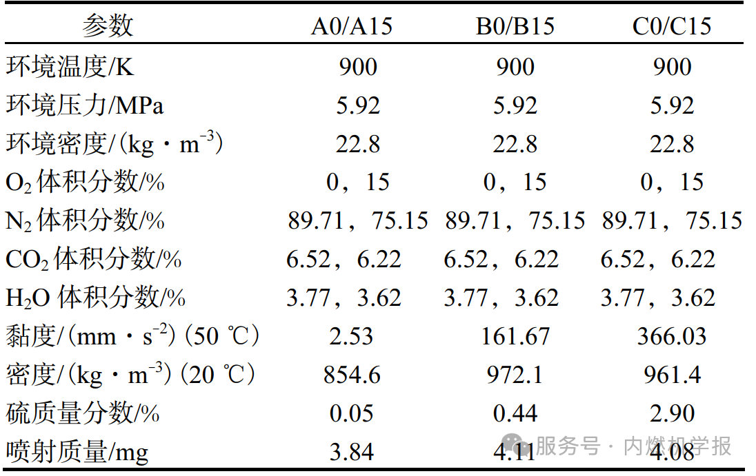 按照是否发生燃烧将喷雾分成无氧条件下非反应喷雾及含氧条件下的反应喷雾。笔者使用的燃料性质、CVCC 内的初始条件及喷射条件见表 3。研究中使用 3 种硫质量分数、密度和黏度极具代表性的 HFO。燃料的黏度和密度随硫质量分数波动,其中密度最大差异为 12.1%,黏度相差 144 倍。按照黏度(硫质量分数)升序对 HFO 从燃料A~C编号。