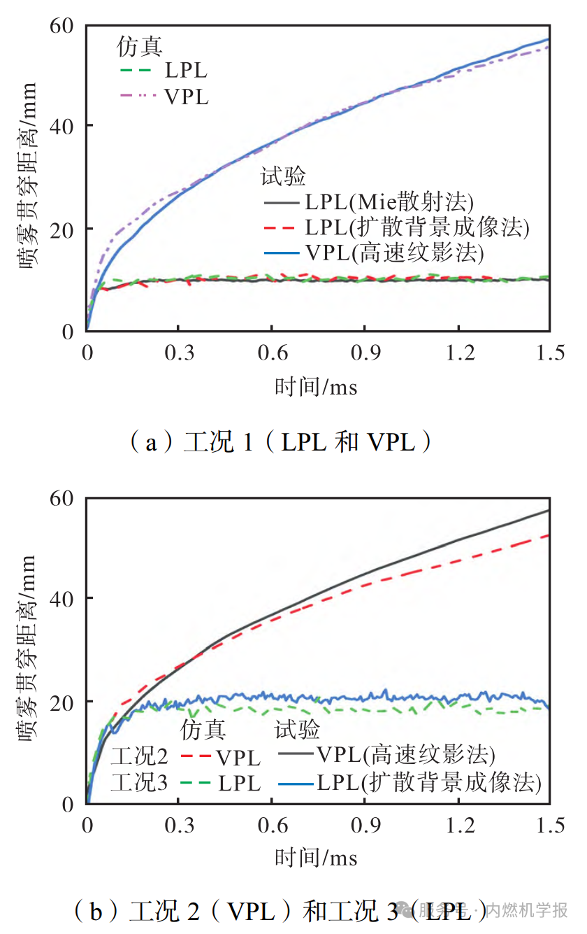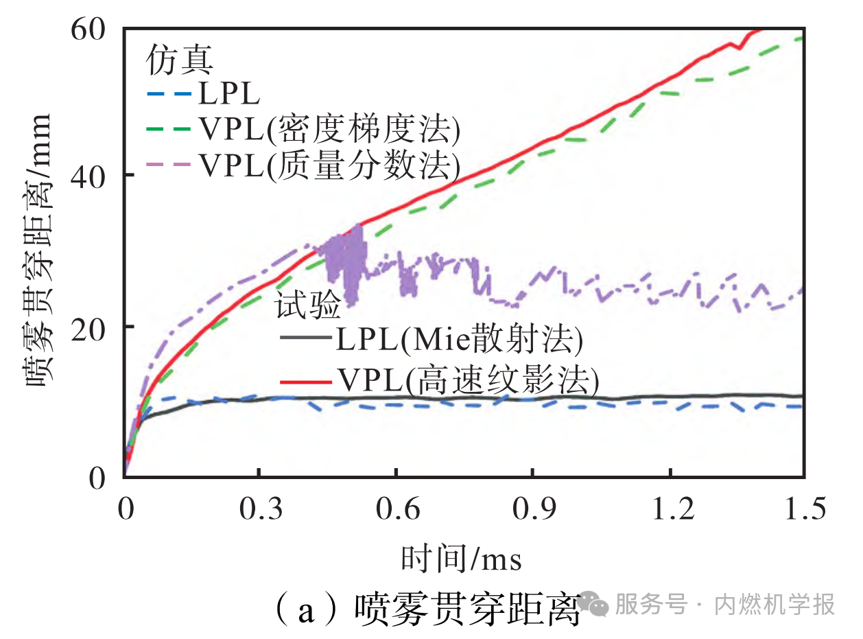 VPL 和 LPL 分别是对应阈值与喷孔的最大垂向距离,表征了燃料射流的穿透能力。试验中使用高速纹影法、扩散背景成像法和 Mie 散射法获得喷雾的 VPL 和 LPL,仿真中使用质量分数法和密度梯度法获得 VPL 和 LPL。图 2 为工况 1、2 和 3 下 CVCC 模型的验证。该模型能较好地描述非反应条件下燃料的喷射和雾化过程。