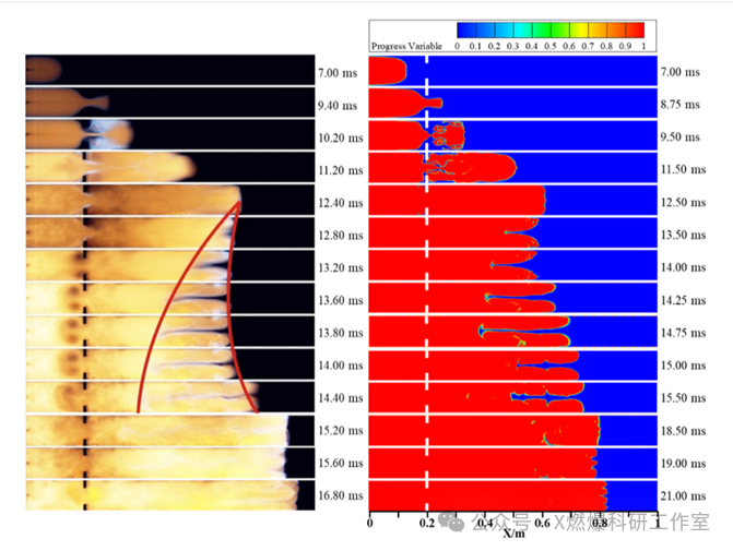 图2-3分别比较了BR = 0和0.5时合成气/空气火焰结构的实验和模拟图像。仿真结果与实验结果之间的密切相关性证明了大涡模拟的准确性。图2显示了在初始阶段火焰是半球形的。之后,火焰逐渐变为指状(t = 7.00 ms)。在此期间,火焰表面积快速增长。然后,在t = 9.00 ms时,火焰裙部接触侧壁,并且火焰表面积减小直到t = 13.00 ms,此时火焰发展成平面形状。随后,火焰中心向燃烧区弯曲,表现为“郁金香”火焰。当“郁金香”火焰完全形成时,经历了明显的扭曲,在“郁金香”火焰的上唇和下唇上都出现了小的、尖的凹陷,从而产生了新的“郁金香”火焰。这种火焰命名为扭曲的“郁金香”火焰(DTF)。此后,火焰继续以DTF结构传播,直到到达管道端部。