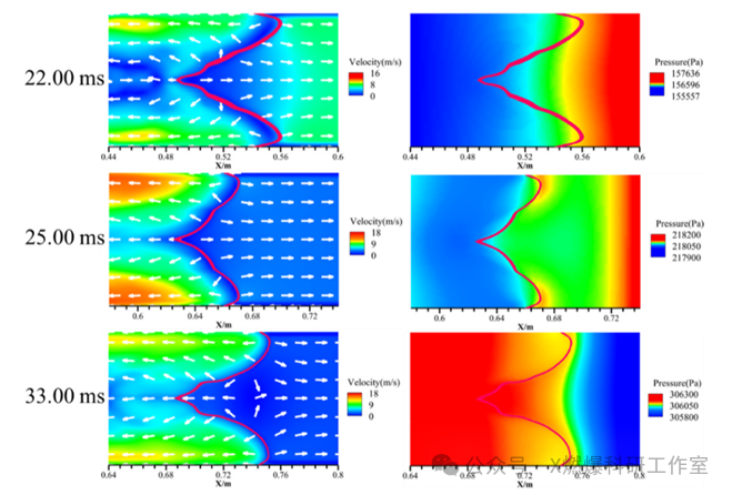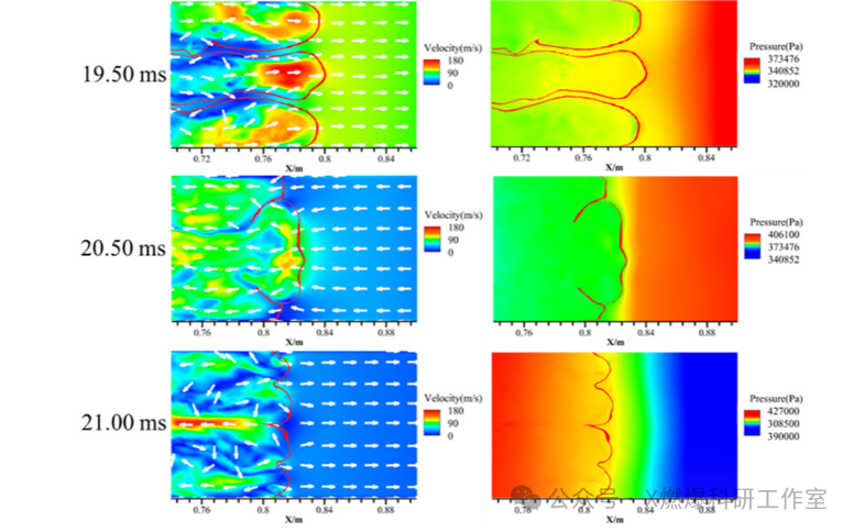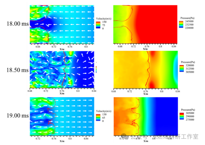 图8说明了从“郁金香”火焰到双“郁金香”火焰整个发展过程中速度场和压力场的变化。如图8中t = 18.00 ms处所示,压力梯度和流场主要为负,而火焰唇之间的流场为正。因此,火焰唇的移动向左移动,而尖点向右移动,导致火焰唇彼此更靠近。最后,上火焰唇和下火焰唇几乎合并在一起,如图8中t = 18.50 ms处所示。在这一点上,流场是正向的,在所有的区域,除了在侧壁附近的燃烧气体中的涡流。燃烧区内的速度场分布不均匀。之后,随着压力梯度的变化,出现了双“郁金香”火焰(图8中t = 19.00 ms)。