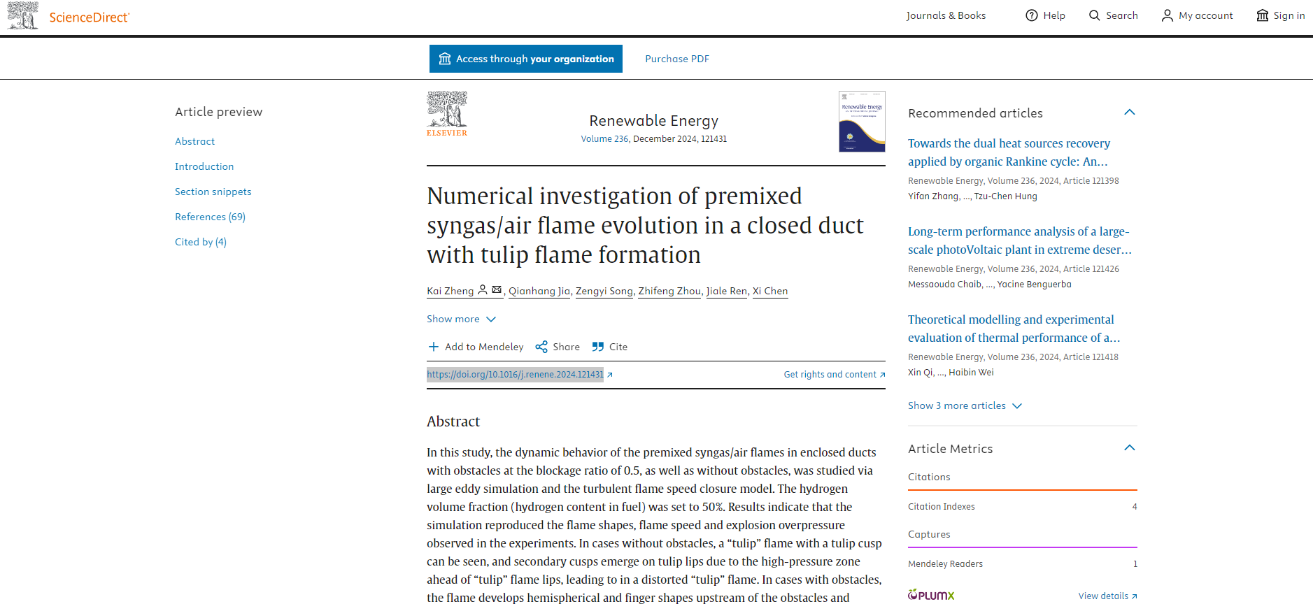 化石燃料能源燃烧产生的排放物对环境造成严重损害。合成气作为一种重要的清洁替代能源,受到了广泛关注。合成气主要由CO和H2组成,热值高,污染小,可以通过多种方法生产。然而,在合成气生产、运输和使用的每个阶段都可能出现安全问题。在实际情况中,合成气/空气爆燃火焰在传播期间可能遇到障碍物。根据先前众多研究,火焰通过障碍物后,会出现一种新的“郁金香”火焰。但是,由于现有实验数据和方法的局限性,这一现象背后的根本原因尚未揭示。本研究旨在探索新观察到的“郁金香”火焰发展模式的根本原因,可以为合成气安全提供重要的科学指导,并为其他清洁能源的安全提供科学的方法指导。