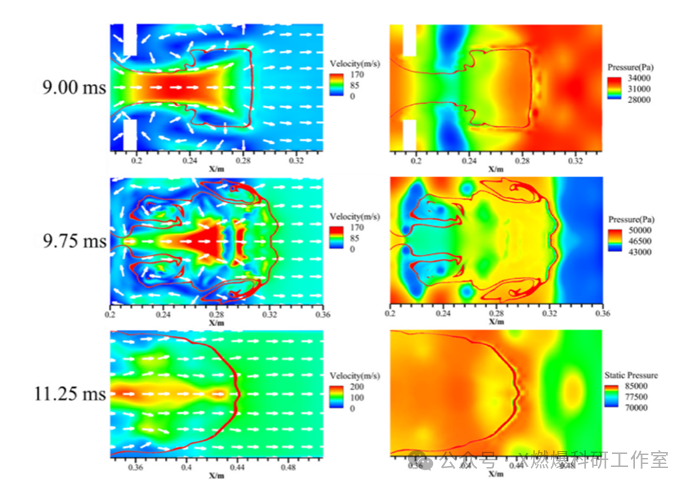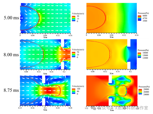 图6-7显示了当BR = 0.5时,火焰接近和通过障碍物时,火焰前沿附近的速度场和压力场。与BR = 0时类似,点火后压力梯度为正(t = 5.00-8.00 ms,如图6所示)。之后,火焰从障碍物喷出,导致火焰速度和过压的快速激增(在t = 8.00-8.50 ms)。此时,障碍物下游出现一对压力稀疏区域,并伴随着涡流的形成(图6中t = 8.75 ms)。在通过障碍物时,火焰裙被卷入涡流中。火焰呈现蘑菇状结构,伴随着火焰速度的降低。随后,障碍物下游的残余混合物被消耗,并且燃烧产物的膨胀推动火焰以更高的速度向右传播。
