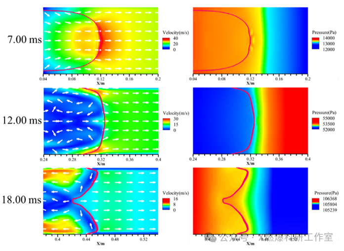 图4-5显示了当BR = 0时,在郁金香形火焰和扭曲郁金香形火焰(DTF)产生过程中的速度场和压力场变化。白色箭头表示矢量速度方向,红线表示火焰前沿。气体向右传播被认为是正方向。如图4中t = 7.00 ms时所示,火焰呈指状,火焰前沿附近为正压梯度。之后,出现了一个逆压力梯度。火焰前沿中心的速度场减小,而靠近侧壁的火焰前缘速度场增大。混合气中的流场是正的,而燃烧气体中的流场主要是负的。这有助于产生平面火焰(图4中t = 12.00 ms时)。此时,在靠近侧壁的火焰前沿后面产生涡流。由于斜压效应,燃烧区内的气流固有地呈漩涡状。然后,在涡流的对流作用下,火焰前沿向燃烧区推进,形成一个原始的后尖点(图4中t = 18.00 ms处)。其它研究表明,当存在平面火焰时,会在火焰前沿附近形成明显的逆压梯度。此外,燃烧气体中的上、下涡流分别为顺时针和逆时针。然后火焰演变成经典的“郁金香”火焰。