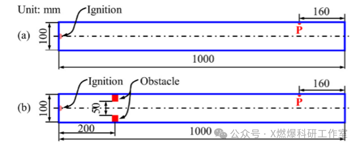 如图1所示,模型尺寸为100 mm × 100 mm × 1000 mm。在距离左端200 mm的上下壁布置了两个阻塞比(BR)为0.5的障碍物。点火点在左端中心半径为5 mm的半球形区域内。在管道的上壁上,设置了一个监测点P,用于压力收集。模拟的初始条件设定为大约0.1 MPa压力和300 K温度。
