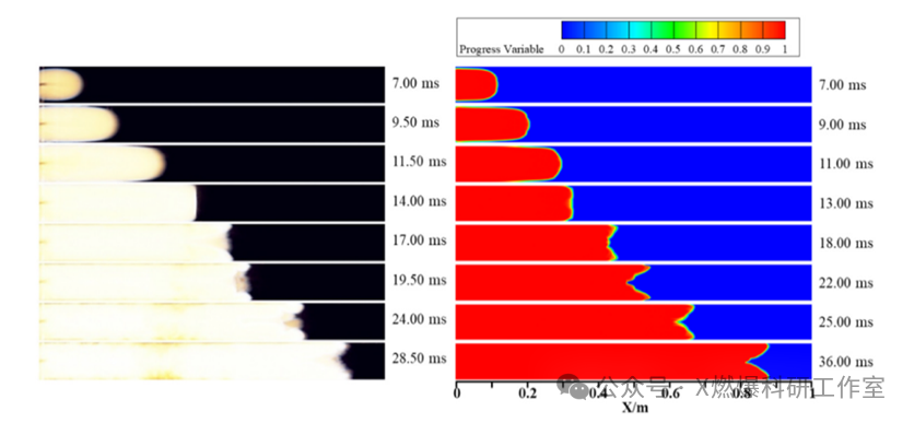 采用大涡模拟方法研究了封闭管道内合成气/空气预混火焰的演化过程。研究的主要结果如下所示。