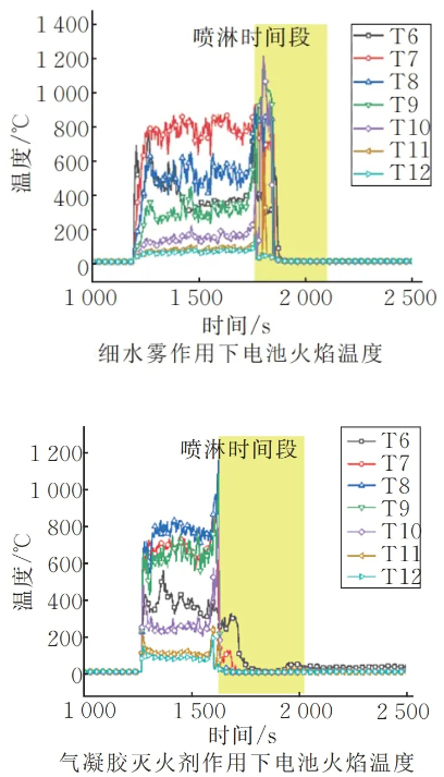 1)气凝胶灭火剂具备阻断热失控发展的能力,可有效扑灭电池明火,同样工况下比细水雾降低约70s。
