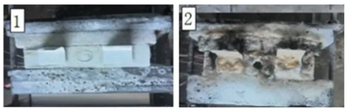 通过满荷电状态下的100 Ah磷酸铁锂储能电池热失控演变过程特征参数划分锂离子电池热失控阶段,识别出三个灾害演变特征拐点作为灭火剂施加的指导节点。在相同节点分别施加灭火参数一致的气凝胶泡沫灭火剂与细水雾,开展灭火对比测试。通过比较细水雾和气凝胶泡沫灭火剂在指导节点喷洒后锂离子电池外壳与电池火焰温度曲线,分析在不同热失控阶段内气凝胶泡沫灭火剂相较细水雾灭火抑制效果的优势及原理。研究结果表明,触发明火前施加灭火剂均可有效阻断电池内部放热副反应,两者表现出相似的冷却效能;电池起火后,气凝胶泡沫灭火剂展现出更为出色的明火抑制效果,其接触电池表面形成的致密泡沫可有效阻隔氧气,实现快速灭火,如图2所示。